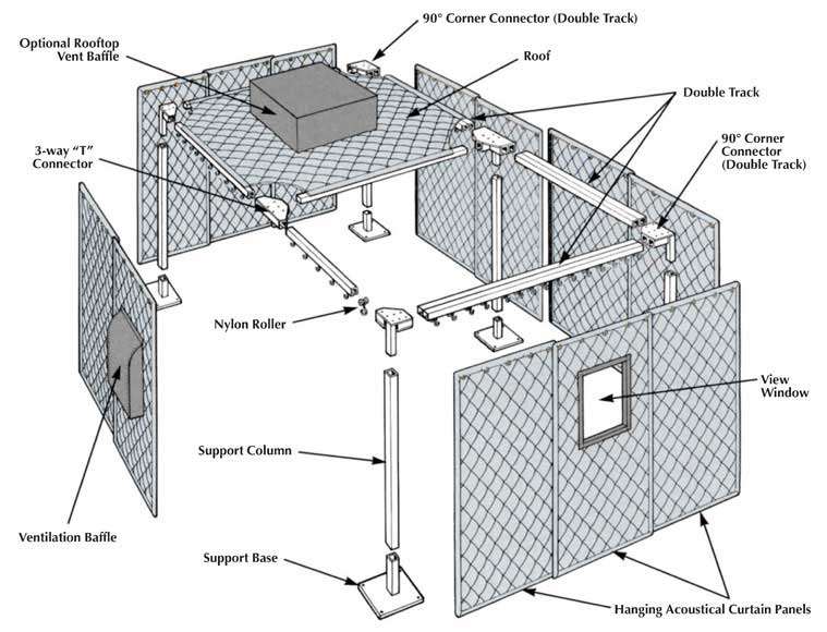 Standard acoustical barrier screens run 4 feet wide by 8 feet high, but custom-made screens are available. The screen consists of an 18-gauge steel frame with supporting legs and curtain panels which are fastened to the top of the screen with grommets. Barrier screens are an effective means of noise control where mobility is desired.