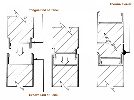The panel assembly sequence illustrated shows the assembly of the oven panel system. First, a panel is placed in the base made of two angles that allow a thermal break. A second adjoining panel is then placed in the base and aligned with the first panel. The tongue end of the second panel is started in to the groove end of the first panel and maneuvered into place. Top and bottom of the panels are secured mid-span to the trim to allow small thermal expansion to occur at the joint. A bead of non-hardening, thermal sealer is then run along the entire length of the outside surface in the recess formed by the mating of the tongue-and-groove ends of the two panels.
